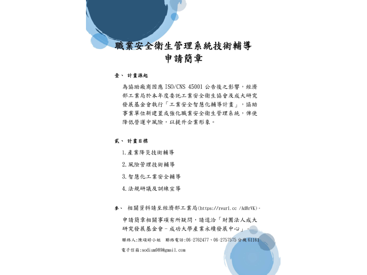 Read more 112年度職業安全衛生管理系統技術輔導工業安全衛生協會及成大研究發展基金會執行「工業安全智慧化輔導計畫」