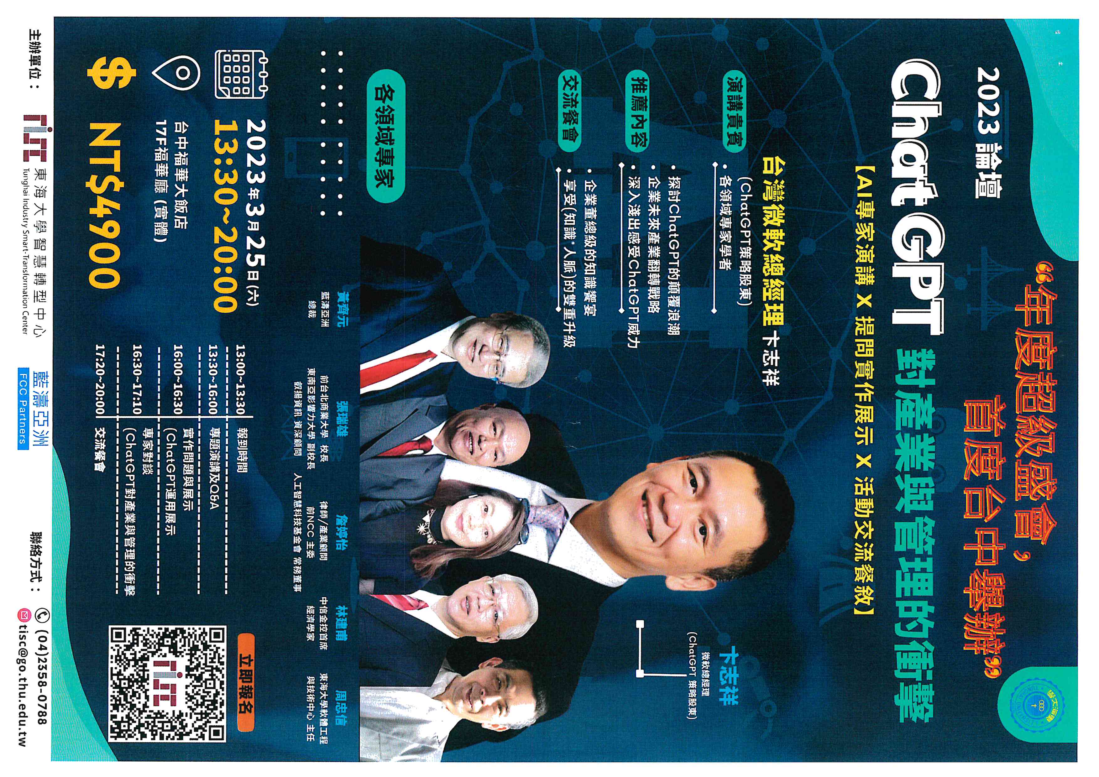 Read more ChatGPT對產業的衝擊與管理由東海大學智慧轉型中心主辦,促進業界交流與規劃未來產業發展戰略,本次活動對象為企業董事長、總經理,非技術人員,這不是一般的技術探討,更重要的是從策略、管理、社會及經濟等層面,來探討ChatGPT因應之道。 -